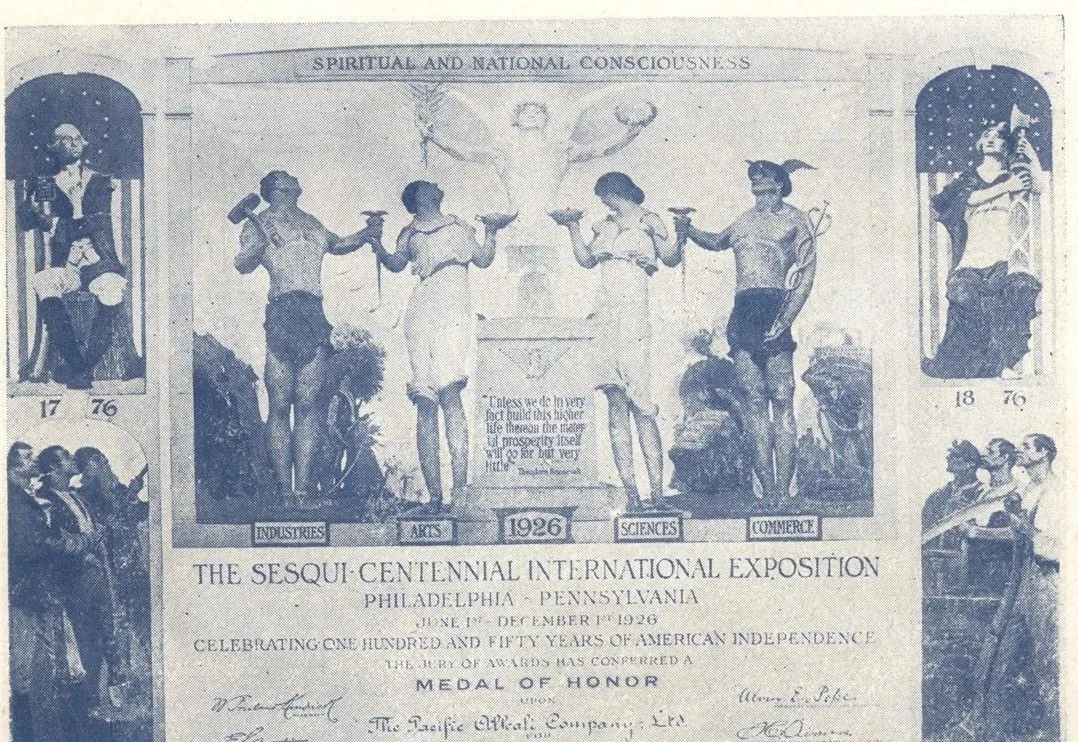 ▲1926年“红三角”牌纯碱荣获美国费城万国博览会最优等奖证书